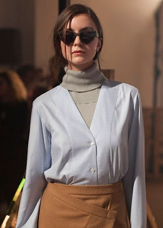 WHAT IT DOES TO THEM: The padded yet slinky nature of the clothes on display exude protection and comfort –a simulated reality in which the wearer is truly protected and removed from the looming, dark, cloud of the future and the unknown. The piece that most reflects this cocooned effect is a yellow, turtleneck wool jumper that covers the model up to just below her eyes. There is a sense of allure and sexual appeal that accompanies this look – the material draping and taking the shape of her face and neck.